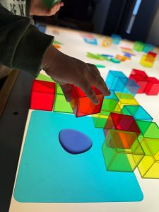 Wir gehen in die Lernwerkstätte, für die wir uns im Morgenkreis entschieden haben. Unser Garten ist übrigens auch eine tolle Lernwerkstatt. Ich gehe heute mit meiner Freundin in das Atelier, während mein bester Freund sich für die Bewegungswerkstatt entschieden hat. Wir dürfen mit unserem Werkstattdiplom dort alleine hingehen und uns beschäftigen.