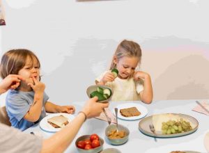 Erst helfe ich dabei, den Tisch zu decken. Gerne binde ich den jüngeren Kindern ein Lätzchen um oder fülle das Glas für sie auf. Nach einem gemeinsamen Tischspruch freuen wir uns auf das frisch gekochte Essen aus der kinderKüche.